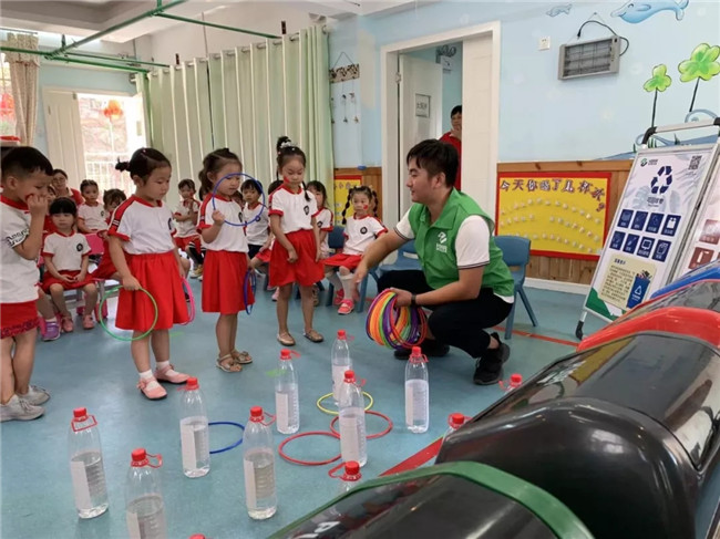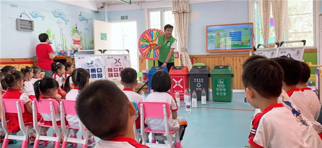通俗易懂的講解后,孩子們對垃圾分類有了一個初步的認識。接下來開展孩子們喜歡的游戲互動環(huán)節(jié),通過“垃圾分類問答轉(zhuǎn)盤”、“分類套圈圈”的小游戲,孩子們在歡聲笑語中學(xué)習(xí)到了豐富的垃圾分類知識。